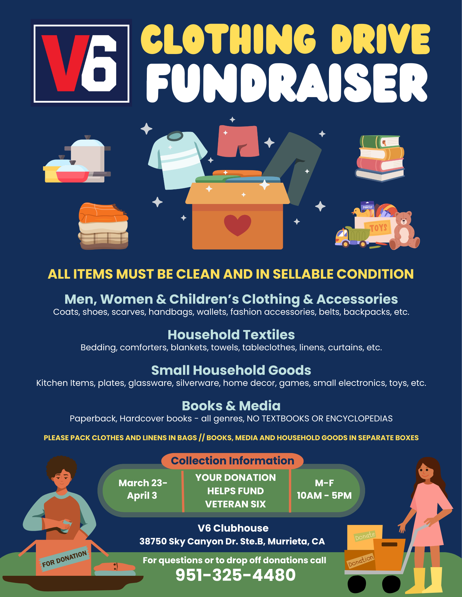 Clean out your closets for Veteran Six. Drop off your donations to the V6 Clubhouse March 23 - April 3 between 10am - 5pm.
